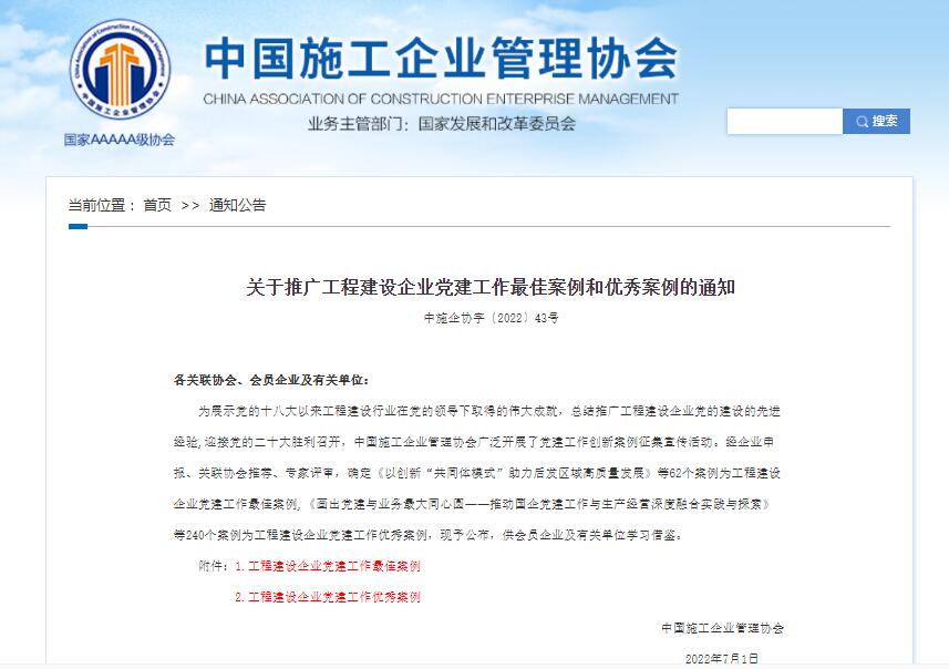 为展示党的十八大以来工程建设行业在党的领导下取得的伟大成就,总结推广工程建设企业党的建设的先进经验,迎接党的二十大胜利召开,近日,中国施工企业管理协会组织开展了工程建设企业党建工作优秀案例评审工作,山东水总有限公司第六分公司党支部的《塑品牌抓活动促活力 切实提升党建工作水平》案例获评“工程建设企业党建工作优秀案例”。