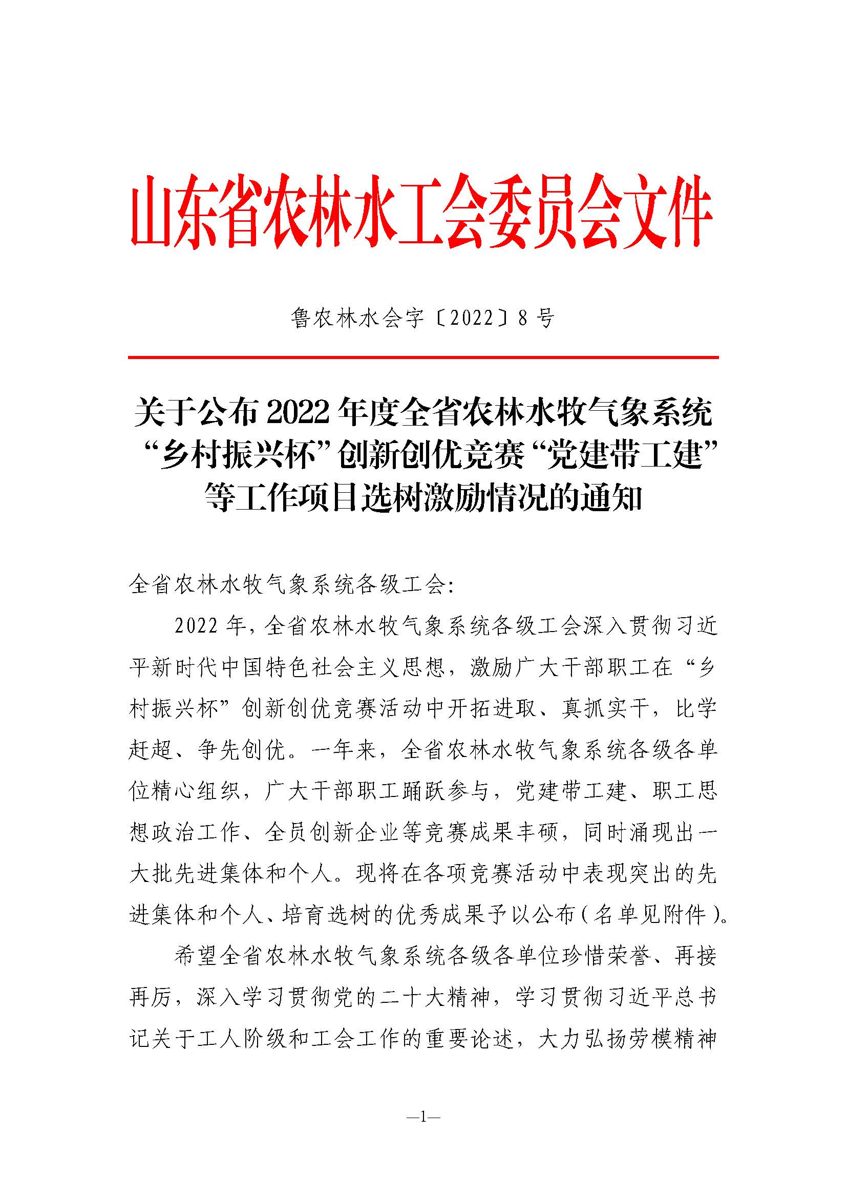 近日,山东省农林水工会委员会下发《关于公布2022年度全省农林水牧气象系统“乡村振兴杯”创新创优竞赛等工作项目选树激励情况的通知》,对涌现出的先进集体、个人和优秀案例予以通报表扬。第六分公司报送的《以“党建+”系列活动为抓手 实施“党建带工建项目化”管理》和基础公司报送的《党建带工建 携手共建》两个案例荣获“党建带工建、工建促党建”优秀案例;第二分公司报送的《坚持以人为本 结合实际开展职工思想政治工作》荣获“职工思想政治工作”优秀案例;刘永恩同志荣获第二届“身边的爱岗敬业榜样”;苏强、谢金虎、李云贺同志荣获“职工安全隐患排查竞赛优秀个人”。